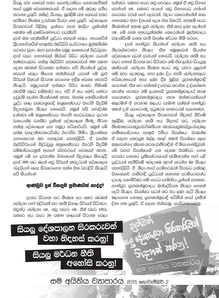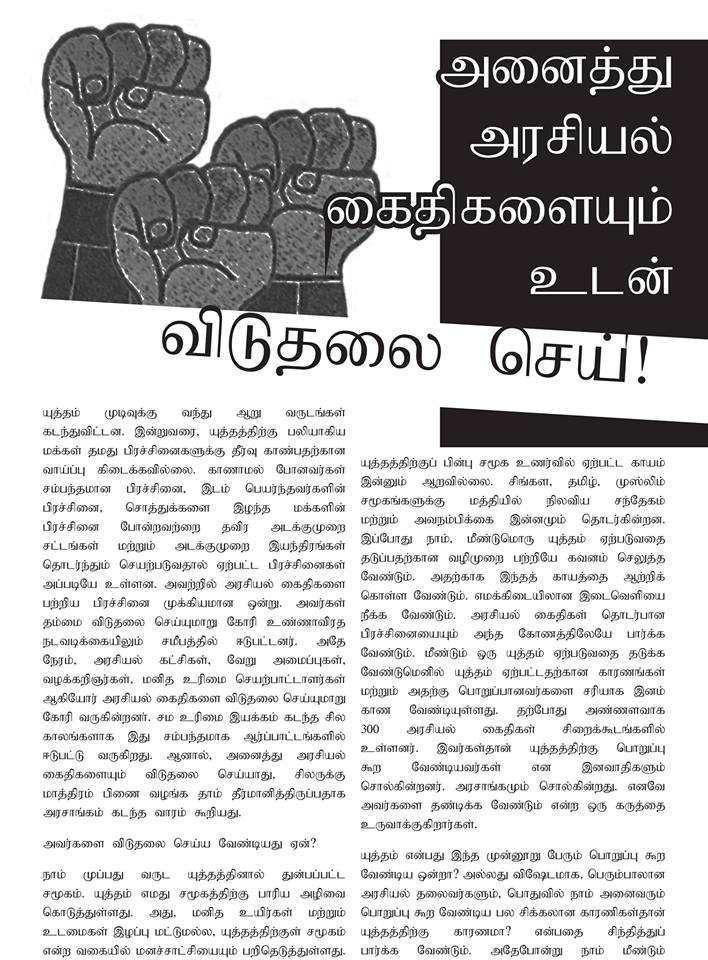 குற்றமில்லாதவர்களை விடுதலை செய்து, குற்றமுள்ளவர்கள் மீது வழக்கு தொடுத்தல் என்ற நீர்த்துப்போன கோஷத்திற்குள் அனைத்து அரசியல் கைதிகளின் விடுதலையை மறுத்து நிற்கின்றது தமிழ் தேசிய கூட்டமைப்பு என்கின்ற போலி எதிர்க்கட்சி;. அதற்கான நெருக்குதலை கொடுத்தவர்கள் எதிர்கட்சியாக முயற்சி செய்த இனவாதிகள். எனவே, அரசாங்கம் மற்றும் இந்த போலி எதிர்க்கட்சி ஆகிய இரண்டையும் ஒருசேர தோற்கடிக்காமல் மீண்டும் ஒற்றுமைபடுத்தவோ, யுத்த ஆபத்தை தடுக்கவோ முடியாதென்பது தெளிவு. ஆகவே, எமது பரம்பரையை துன்பத்தில் ஆழ்த்திய ஒரு இனவாத யுத்தம் எதிர்கால சந்ததியின் மீது சுமத்தப்படாதிருக்க வேண்டுமாயின் அதற்காக மக்கள் முன்வர வேண்டும். அரசாங்கம் ஜனநாயகத்தை தட்டில் வைத்து தருமென, எதிர்க்கட்சி போராடி அதனை பெற்றுத் தருமென எதிர்பார்க்காது ஜனநாயக உரிமைகளை எமது கரங்களால் நாம் வெல்ல வேண்டும். அதற்காக ஒன்றிணைவோம், நிறுவனமாவோம்.