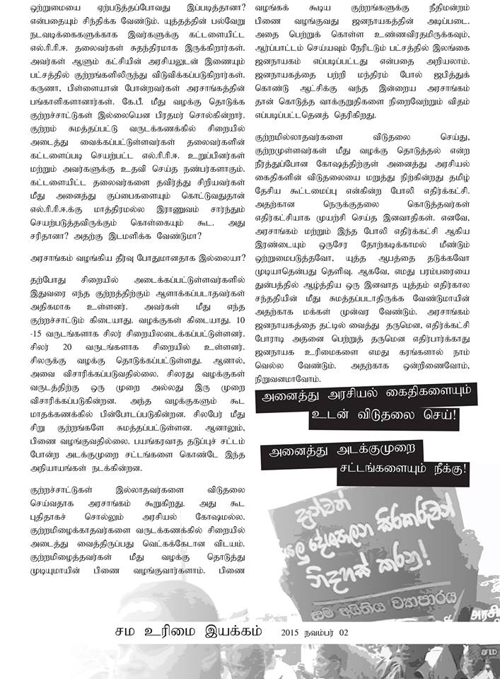 யுத்தம் முடிவுக்கு வந்து ஆறு வருடங்கள் கடந்துவிட்டன. இன்றுவரை, யுத்தத்திற்கு பலியாகிய மக்கள் தமது பிரச்சினைகளுக்கு தீர்வு காண்பதற்கான வாய்ப்பு கிடைக்கவில்லை. காணாமல் போனவர்கள் சம்பந்தமான பிரச்சினை, இடம் பெயர்ந்தவர்களின் பிரச்சினை, சொத்துக்களை இழந்த மக்களின் பிரச்சினை போன்றவற்றை தவிர அடக்குமுறை சட்டங்கள் மற்றும் அடக்குமுறை இயந்திரங்கள் தொடர்ந்தும் செயற்படுவதால் ஏற்பட்ட பிரச்சினைகள் அப்படியே உள்ளன. அவற்றில் அரசியல் கைதிகளை பற்றிய பிரச்சினை முக்கியமான ஒன்று. அவர்கள் தம்மை விடுதலை செய்யுமாறு கோரி உண்ணாவிரத நடவடிக்கையிலும் சமீபத்தில் ஈடுபட்டனர். அதே நேரம், அரசியல் கட்சிகள், வேறு அமைப்புகள், வழக்கறிஞர்கள், மனித உரிமை செயற்பாட்டாளர்கள் ஆகியோர் அரசியல் கைதிகளை விடுதலை செய்யுமாறு கோரி வருகின்றனர். சம உரிமை இயக்கம் கடந்த சில காலங்களாக இது சம்பந்தமாக ஆர்ப்பாட்டங்களில் ஈடுபட்டு வருகிறது. ஆனால், அனைத்து அரசியல் கைதிகளையும் விடுதலை செய்யாது, சிலருக்கு மாத்திரம் பிணை வழங்க தாம் தீர்மானித்திருப்பதாக அரசாங்கம் கடந்த வாரம் கூறியது.