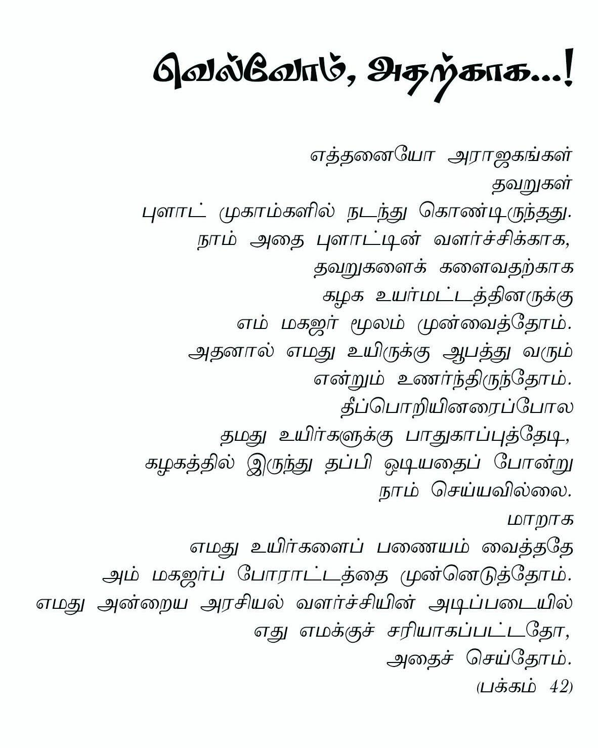 சிங்கள பெருந்தேசியவாதிகளின் கொலைகளையும், சித்திரவதைகளையும் எதிர்த்து இயக்கங்களில் சேர்ந்தவர்களை அந்த இயக்கத்தலைவர்களே மரணத்தின் இருள்வெளிகளிற்கு மறுபடி தள்ளினார்கள். இயக்கத்தலைமைகளின் அராஜகத்தை, ஜனநாயக மறுப்பை எதிர்த்தவர்கள் கொல்லப்பட்டனர். மக்கள் போராட்டத்தை நம்பாமல் ஆயுதங்களையும், அந்நிய சக்திகளையும் சார்ந்திருப்பதை கேள்வி கேட்டவர்கள் சிறை வைக்கப்பட்டனர். இன்னொரு தமிழ் இயக்கத்தின் ஆதரவாளனாக, உளவாளியாக இருக்கலாம் என்ற ஒரு சிறு சந்தேகமே பல அப்பாவிகளின் உயிரைப் பறித்தது. எந்த உயிரினதும் ஆதார உணர்ச்சியான காதல் மனதில் மலர்ந்தது என்ற காரணத்திற்காகவே மண்ணிற்குள்ளே பலர் புதைக்கப்பட்டார்கள்
